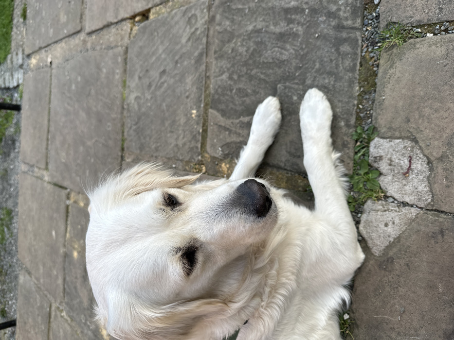 - "A light-colored Golden Retriever, or similar breed, is depicted lying on a paved outdoor surface in Brentwood, United Kingdom" by FM-XMDnw2, licensed under CC BY 4.0