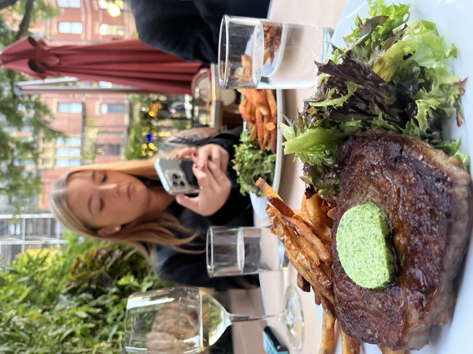 An outdoor dining scene is depicted, located in the Back Bay neighborhood of Boston, Massachusetts, United States, characterized by multi-story brick buildings visible in the background. In the foreground, a white plate holds a seared steak topped with a circular pat of green herb butter, accompanied by a generous portion of golden-brown french fries and a mixed green salad. To the left, a stemmed wine glass contains white wine, and a clear glass of water is nearby. In the midground, a young Caucasian woman with long blonde hair, wearing a black top, is seated at a light-colored table. She is engrossed in a silver smartphone, held in both hands, with her red-painted fingernails visible. Beyond her, a blurred second plate contains sweet potato fries and a small salad, and another clear glass of water is present. The shoulder of another individual in a dark jacket is partially visible on the far right. The background features lush green foliage on the left and a collapsed red patio umbrella on the right. Beyond these elements, brick townhouses with windows are clearly visible, one of which has scaffolding erected on its facade. Scattered, blurred decorative lights are also present.