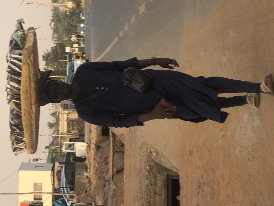 A man wearing a dark blue robe and a crossbody bag balances a large, flat, oval tray stacked high with various items on his head. He holds a red object in his hand. He stands on a dirt path next to a paved road with sparse traffic. Buildings are visible in the background.