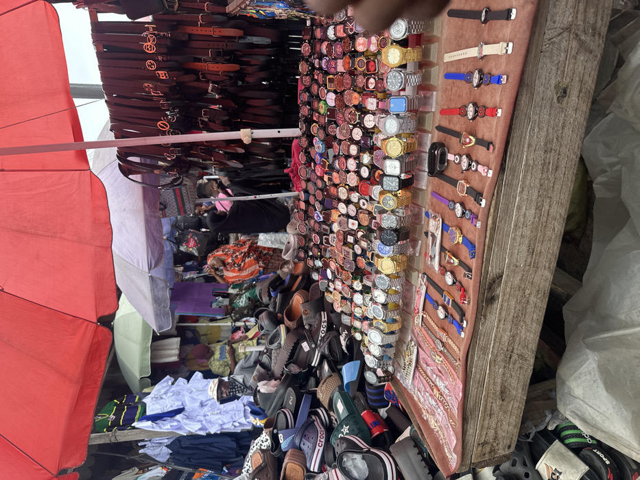 This image depicts an outdoor market scene in Dar es-Salaam, Tanzania. In the foreground, a wooden market stall is heavily laden with merchandise. On the left side of the stall, a pile of assorted footwear is visible, including various sandals, slides, and Crocs-style shoes, some with visible brand markings such as "CROCS" and "Gucci." The central and right sections of the stall feature a dense display of wristwatches, arranged on tiered stands and flat surfaces. Below the watches, a collection of bracelets and necklaces is laid out on a reddish-brown fabric surface. To the immediate right, a rack holds numerous dark-colored belts with various buckles, hanging vertically. In the midground, several individuals are present within the market environment. To the left, a man wearing a light-colored shirt, a cap, and a dark face covering is partially obscured by merchandise. To his right, a woman in an orange and patterned dress is observed looking upwards. Further right, a woman wearing a black hijab is partially visible behind another market display. Additional market stalls displaying hanging clothing, including white garments and a striped sweater, are visible in the background. Overhead, multiple large market umbrellas provide shade; a prominent red umbrella occupies the upper foreground, with a lighter green and a light purple umbrella visible further back.