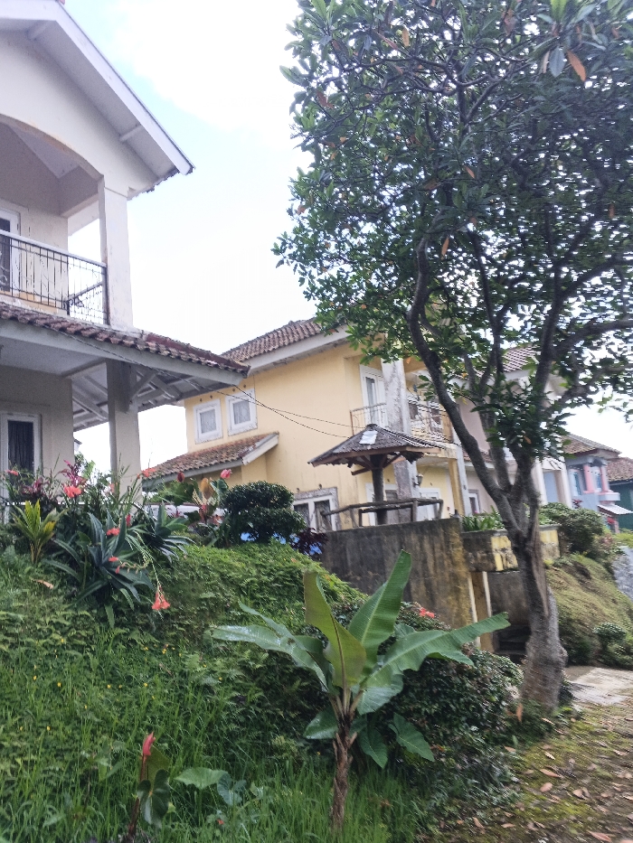 The image displays a residential street scene within Bet Trang Quarter, Cambodia, characterized by sloping terrain and multiple multi-story dwellings. In the foreground, a verdant hillside is covered with dense green grass, various shrubs, and flowering plants exhibiting red and orange blooms. A young banana plant with broad green leaves is centrally located at the bottom. To the right, an established tree with a thick trunk and a full canopy of dark green leaves dominates the upper right quadrant. In the middle ground, a two-story house with light yellow painted walls and a terracotta tiled roof is prominent. It features multiple windows with white frames and at least one balcony with a white railing. Adjacent to this house, a small, open-sided gazebo-like structure with a dark, patterned roof and a wooden frame stands on a concrete platform. Concrete retaining walls, discolored with age and possibly organic growth, support the elevated structures and ground levels. Further to the left, a portion of a two-story house with white or cream-colored walls and a similar tiled roof is visible, featuring a prominent balcony with a black metal railing. In the background, additional residential structures with varied paint colors, including light blue and pink, are discernible on the undulating landscape. The sky above is bright and overcast. No individuals or animals are present.