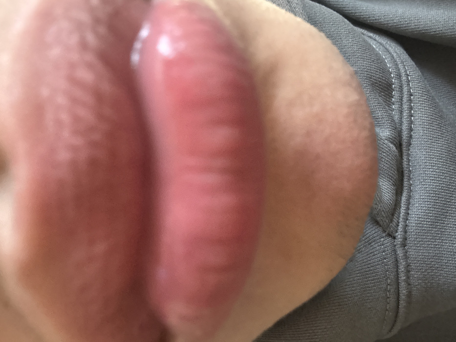 A close-up captures full, glossy lips, pink and slightly parted, showing texture. Adjacent is pale skin with visible pores, transitioning to a gray fabric with stitched seam detailing. Light reflections highlight the lips' plumpness.
