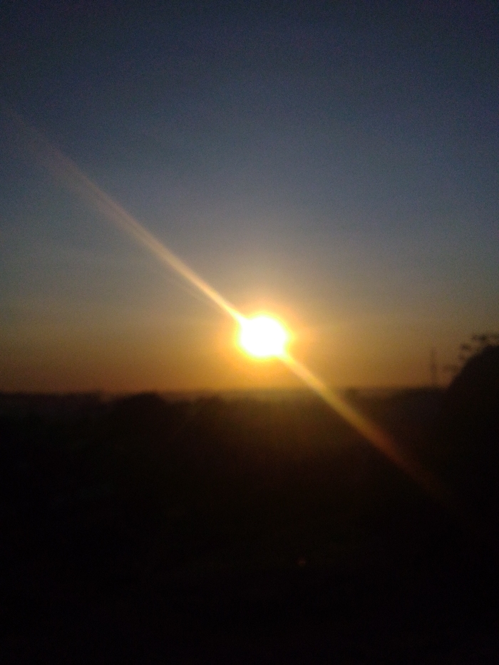 A vibrant sunset dominates the frame. A bright sun, partially obscured by haze, emits intense light rays diagonally across the image. The sky transitions from dark blue to orange near the horizon. Silhouetted trees and foliage form a dark, undefined landscape in the foreground. The photograph is slightly blurred.