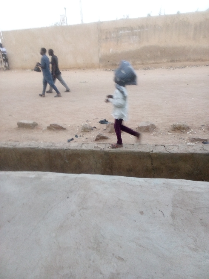 A child balances on the edge of a concrete curb, carrying a large black bag on their head. They wear a light-colored shirt and purple pants. Behind them, two men walk in the opposite direction on a dirt road. A low, light brown wall stretches across the background. The scene is slightly blurry, indicating movement. A portion of a concrete structure dominates the foreground.