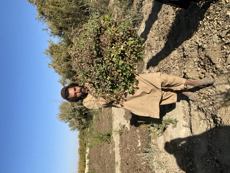 A man in a tan outfit and sandals carries a large bundle of leafy branches on his back in a field