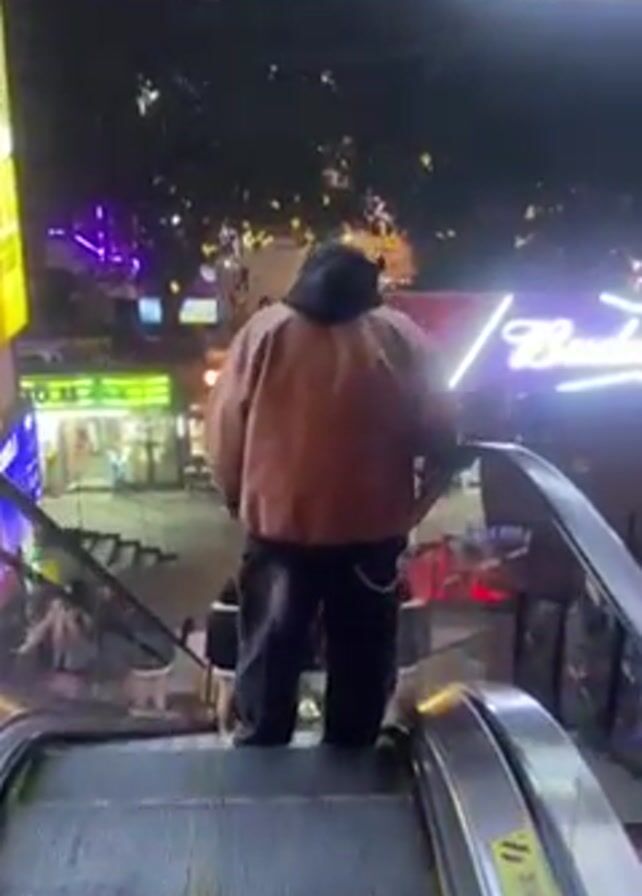 A person wearing a tan jacket and dark pants is riding an escalator down into a city street area at night. There are lit signs and a few other people on the street below. The escalator has metal railings and yellow warning stickers.