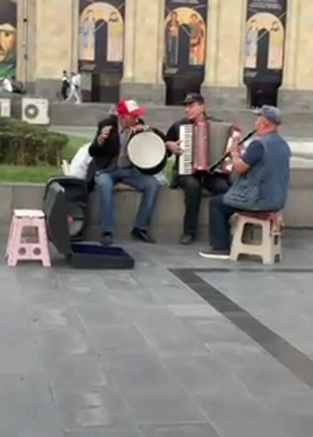 Three men are sitting outside, playing music together. One man is playing an accordion, another is playing a drum-like instrument, and the third is playing a woodwind instrument. They are sitting on small stools in front of a building with arches and banners. A black instrument case sits to the side. The ground is made of grey paving stones. People walk in the background.