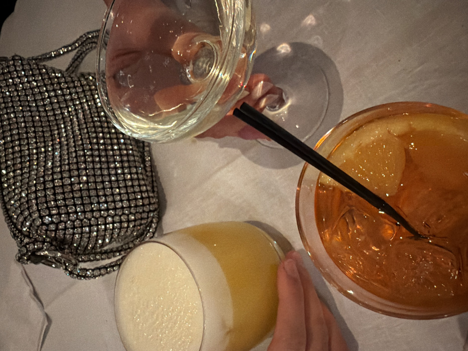 A table setting features an arrangement of drinks and a small purse. A glass of white wine is tilted, as if being poured. Nearby, a glass holds a frothy yellow drink. A cocktail, possibly an Aperol spritz, with ice and a straw, rests beside it. A silver, beaded purse is casually placed near the wine glass. The scene suggests a relaxed social gathering or bar setting.