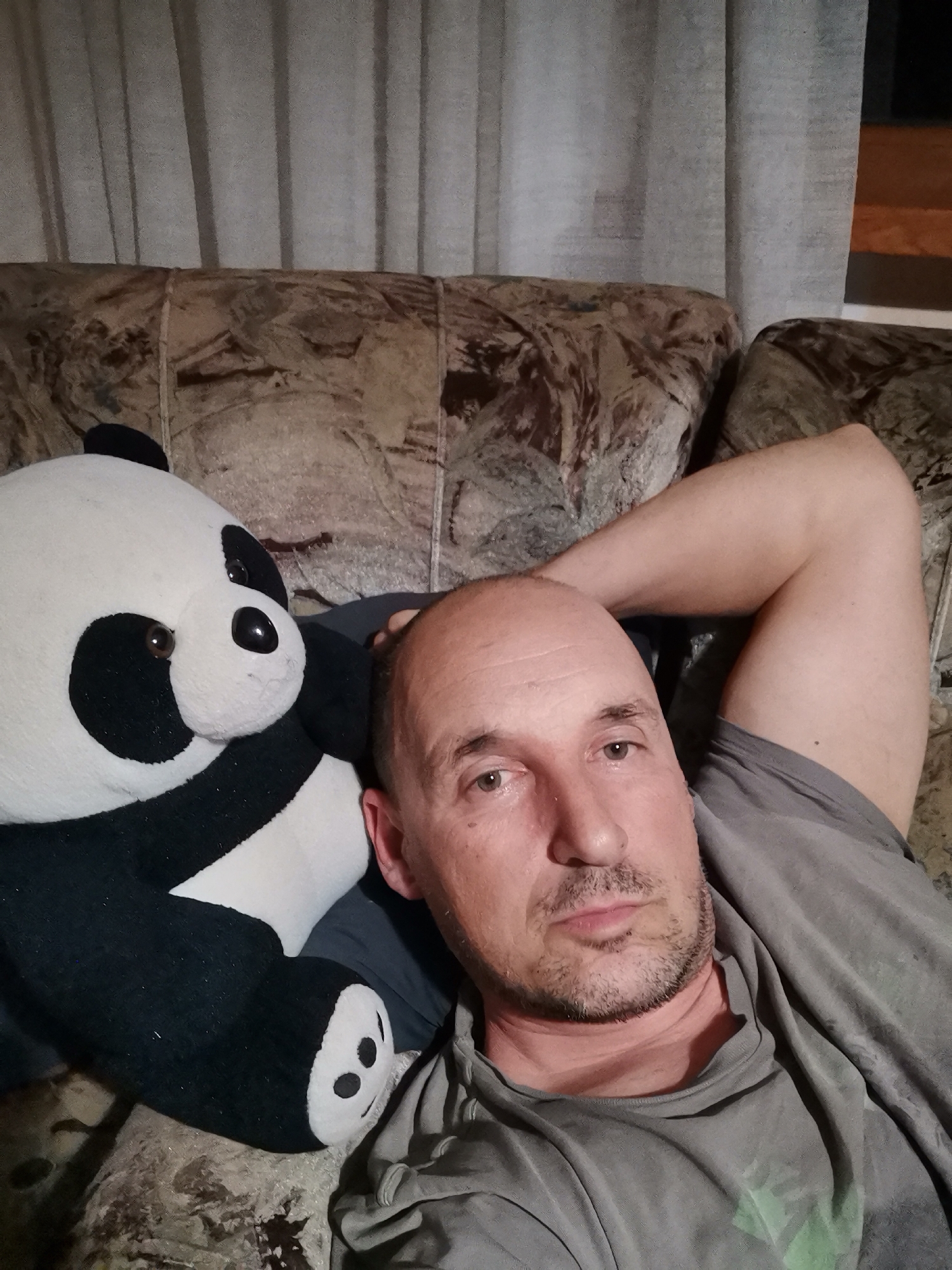 A bald, middle-aged male, with light facial stubble, is lying on his back on a multi-cushioned sofa with patterned upholstery in Obrochishte, Bulgaria. He is wearing a grey t-shirt and has his right arm bent, resting behind his head. His eyes are open, and he is looking directly at the camera. To his left, a large black and white plush panda toy is situated next to him on the sofa. In the background, light-colored curtains are visible, covering what appears to be a window, with a dark frame partially seen on the right.