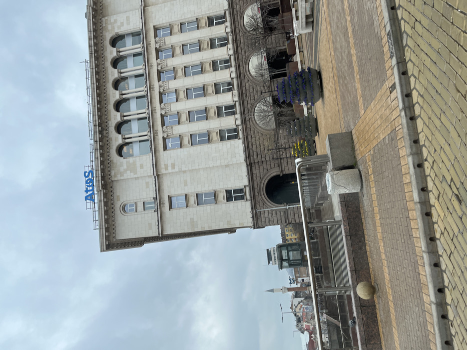 The image presents an exterior view of a multi-story building in Sofia, Bulgaria, identified as the former Party House / current office building at Knyaginya Maria Luiza Blvd. 2, located in the Largo area. The building features a light-colored, stone-clad facade with multiple rows of rectangular windows and an upper level characterized by a series of arched windows. A prominent blue "Atos" sign is affixed to the rooftop. The building's lower levels display a rusticated, darker stone finish with large arched entrances. In the foreground, a public plaza is paved with a pattern of light brown and yellow-gold interlocking pavers, bordered by a gray granite curb with drainage holes. A spherical light-colored stone object rests on the pavement, adjacent to a cracked cylindrical concrete waste receptacle. A stainless steel railing marks a separation between the immediate foreground and a slightly lower section of the plaza. Several large, tiered planter pots containing yellow and purple flowers are spaced across the paved area, with light-colored stone benches visible further back. To the left of the main building, in the mid-ground, the white minaret of the Banya Bashi Mosque rises above other urban structures, including a building with a green-framed rooftop fixture. The sky overhead is uniformly overcast. No individuals, discernible actions, or interactions are present in the scene.