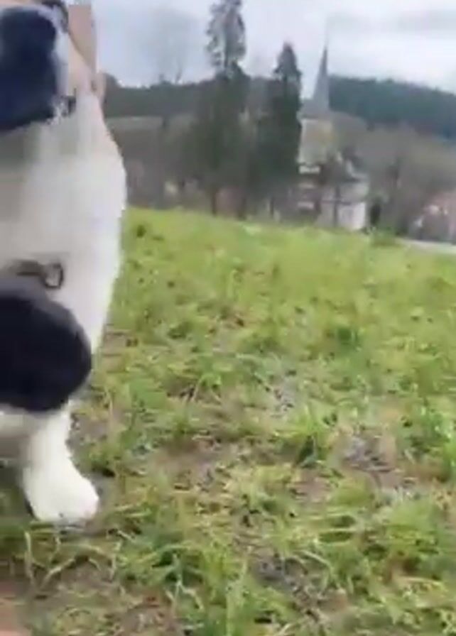 A dog is outside on grass, holding a black object in its mouth that has a red leash attached to it. The dog is a Corgi, with white and tan fur. The grass is patchy and muddy. There is a house in the background, as well as a forest and a light pole. The sky is cloudy and overcast. The dog is moving around with the object in its mouth.