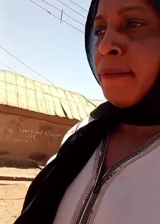 A woman wearing a black hijab and a white tunic with silver trim is looking at the camera. She is outdoors in a sunny area with buildings and power lines in the background.