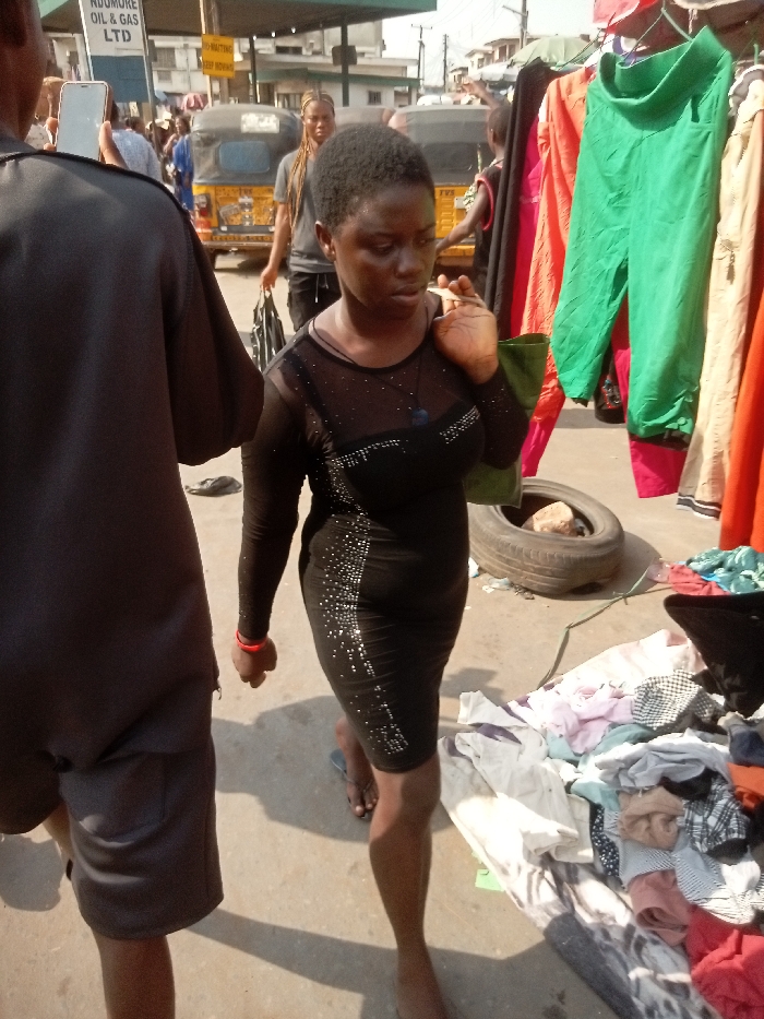 A woman in a fitted black dress with glittering embellishments walks beside a man taking a photo with his phone. The background features a busy street scene with "NDUMOKE OIL & GAS LTD" visible. Clothes are hung on a rack, and a pile of discarded garments sits on the ground, next to a tire. Another woman carries a black handbag in the background with a yellow tuk-tuk nearby.