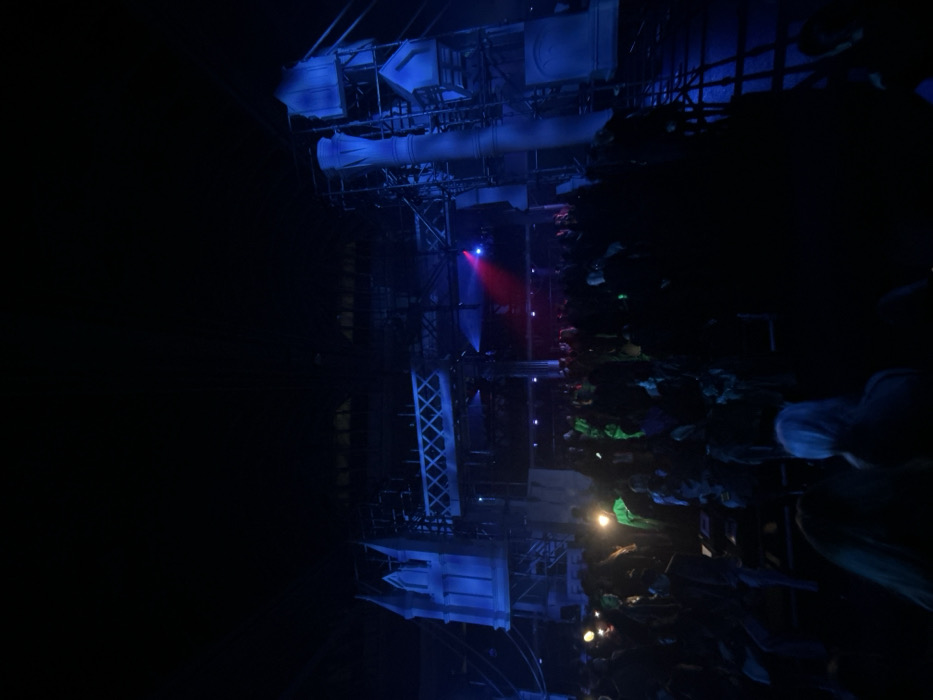 A dark, skewed perspective reveals an industrial structure illuminated by blue and red lighting. The structure features scaffolding, pipes, and rectangular forms, suggesting a stage set or building under construction. The right side fades into blackness, partially obscuring the framework. A red spotlight shines from the middle, contrasting with the predominant blue hues, creating an eerie and imposing atmosphere.