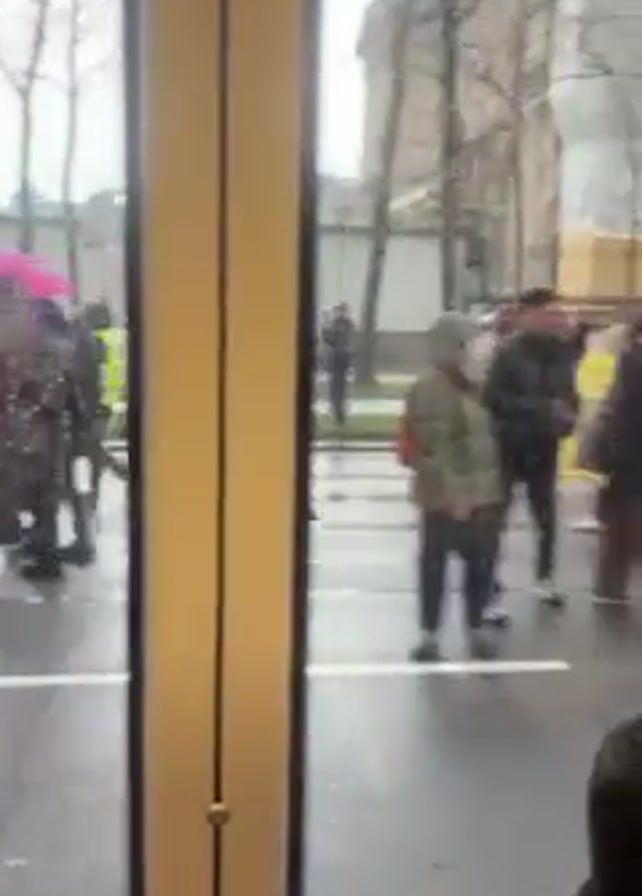 street demonstration taking place in rainy weather, viewed from inside a bus or tram