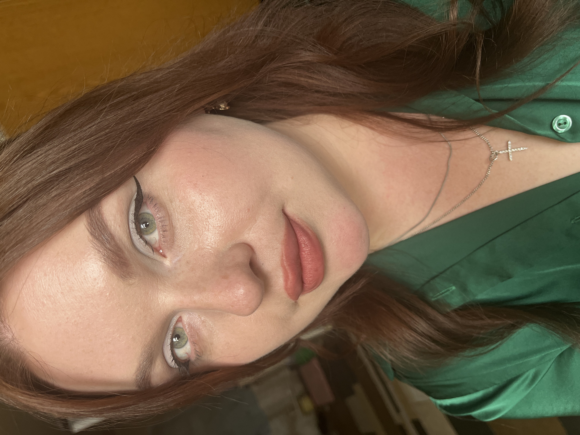 A close-up, chest-up portrait depicts a female subject with fair skin, reddish-brown hair, and green eyes. She is wearing makeup, including white eyeliner on the lower lash line, black winged eyeliner on the upper lash line, and reddish-brown lipstick. The subject is dressed in a deep green, collared, long-sleeved shirt with a satin-like finish. A silver-colored chain necklace with a small, jewel-encrusted cross pendant is visible on her neck. A small, gold-colored hoop earring is present in her right ear. The subject looks directly at the camera with a neutral expression. The background is out of focus, showing a solid yellowish-orange surface to the upper right and indistinct, darker shapes to the left, indicating an indoor environment. The specific location within the city of Павловка, Russia, is not discernible from the visual evidence in the image.