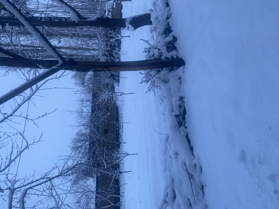 A winter scene features a snow-covered landscape. Leafless trees and branches covered in snow are prominent in the foreground and across the scene. A wooden structure intersects the view. In the background, a building or structure is visible through the trees, also covered in snow. The entire landscape is bathed in soft, blue-tinged light, indicative of a cold, overcast day.