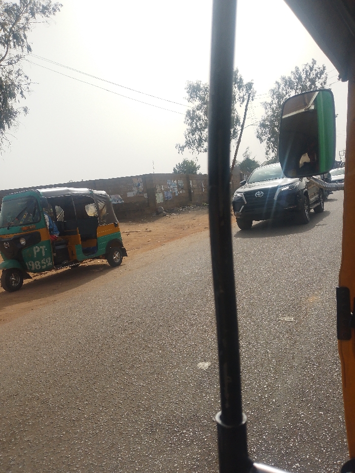 The scene depicts a street in Gura Top, Nigeria, under a hazy sky. A dark-colored Toyota Fortuner SUV with illuminated headlights approaches on the right side of an asphalt road, facing the viewer. On the left side of the road, a green and yellow auto-rickshaw, marked "PT 19852," is positioned, with an individual visible inside. The road is bordered by a dirt shoulder, behind which stands a low brick wall adorned with numerous posters and flyers. Sparse trees and overhead power lines are visible in the background against the bright, diffused sky. The image is captured from within a vehicle, partially showing its yellow frame and a black vertical support bar on the right side.