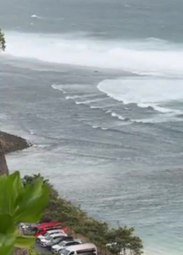 view of the ocean on a cloudy day, with large waves rolling in and crashing on the shore. A cliffside location is indicated by the view from above and the visible vegetation, including green plants in the foreground. There is a row of parked vehicles, including cars and vans, alongside what appears to be a road or parking area adjacent to the cliff. The overall atmosphere suggests a coastal scene during inclement weather.