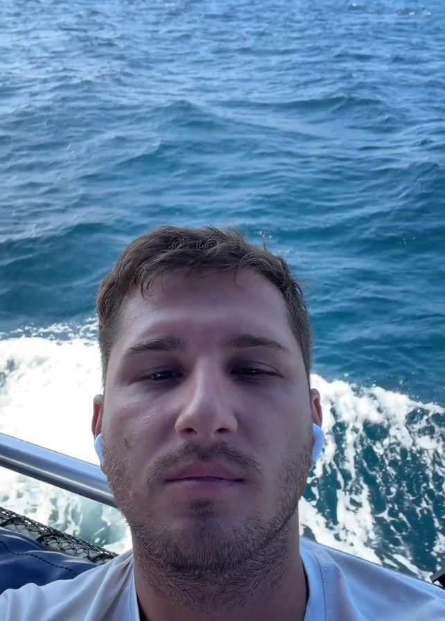 close-up selfie shot of a man on a boat. The man has short brown hair, a light beard, and is wearing white wireless earbuds. He is wearing a white shirt. The boat is moving, as evidenced by the churning blue water behind him. The sky is bright and mostly clear. The man is looking directly at the camera.