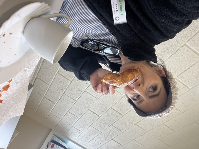 A female subject, identified by an employee badge as Ana A. from "Cactus Poissonnerie," is depicted indoors in Mensdorf, Luxembourg. She is positioned for a close-up shot, wearing a light-colored cap, a dark zipped fleece jacket over a striped shirt, and glasses resting on her collar. Her left hand, featuring red nail polish and a heart tattoo on the ring finger, holds a glazed pastry, which she is actively biting into. Her eyes are directed towards the camera. To the lower right, a white ceramic mug rests on a scallop-edged white plate containing crumbs. Adjacent to the plate, scattered orange fragments lie on a white paper towel. The background consists of a light-colored brick wall, topped by a white ledge. The setting appears to be a staff or break area within a Cactus supermarket.