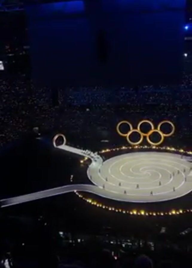 The view from the stadium stands looks out over a circular stage with a spiral design, rimmed with lights. A connected path, also rimmed in lights, extends to the stage. Above the stage are the glowing Olympic rings. A dark screen looms in the background with the stadium lights shining. The stadium is filled with people. The song playing has an electronic rhythm.