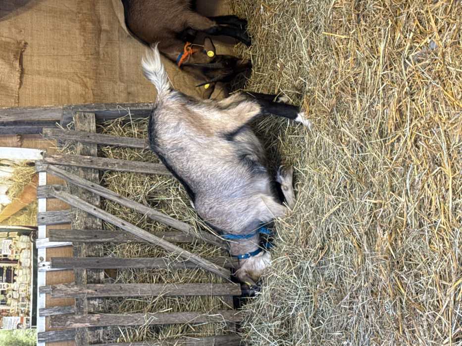 The image depicts an indoor animal enclosure located in Genoa, Italy. The foreground and midground are covered in a thick layer of dry hay. In the center, a medium-sized goat with mottled grey, brown, and black fur is visible. Its lower legs are black with distinct white markings on its hooves. It is wearing a teal blue collar. The goat is in a crouched position, with its front right knee resting on the hay, as its head is lowered and angled through a gap in a rustic wooden fence to consume hay from a trough or pile behind it. Its bushy, light-colored tail is slightly raised. To the right of the central goat, the head and partial body of a second, darker brown goat are visible. This goat is also actively eating hay, with its head down. It wears an orange collar, and a yellow circular tag is visible on its left ear. The background features the aforementioned rustic wooden fence or feeder, constructed from weathered vertical and angled slats, behind which more hay is visible. Beyond this, a wall covered in coarse, light-brown burlap fabric forms the primary backdrop. In the upper left corner, behind the wooden fence, a section of a white display or poster with various items, possibly small bags or crafts, is partially visible. The lighting suggests an indoor setting.