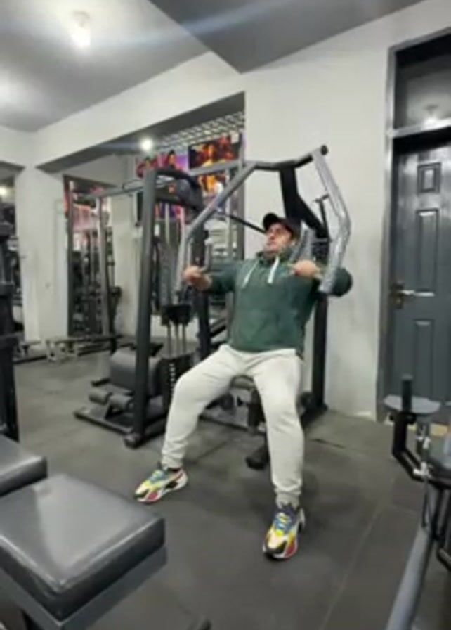 In a well-lit gymnasium, a man is performing a chest press exercise on a machine