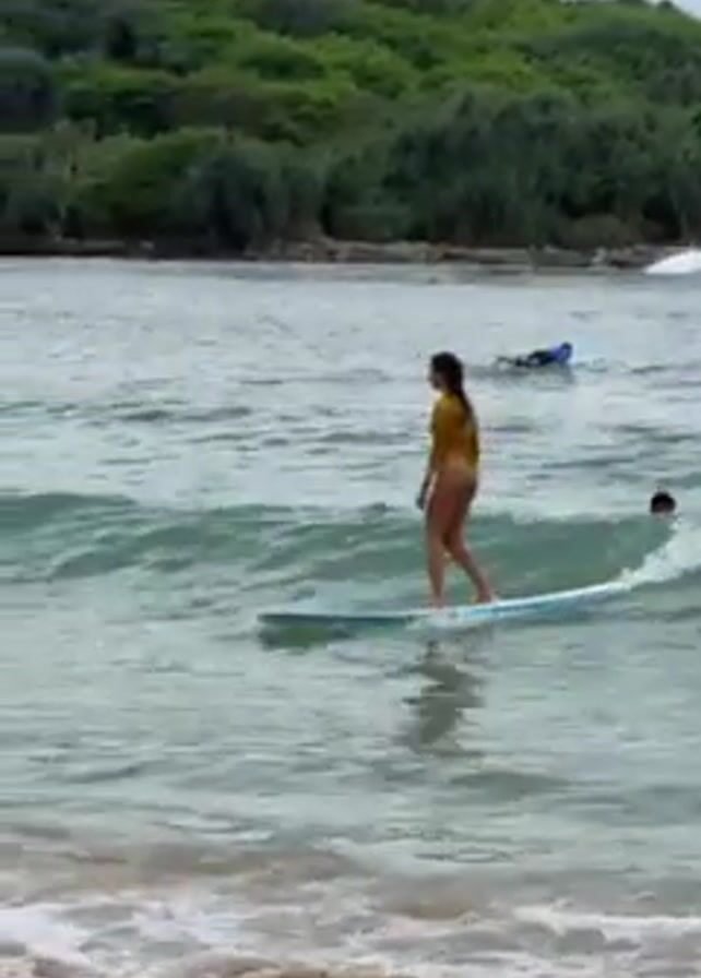 woman surfing in the ocean. She is wearing a yellow swimsuit and is standing on a light blue surfboard. She rides the wave for a few seconds before falling off. Other surfers are visible further out in the water. The background consists of a lush green hill with palm trees and some buildings. The sky is overcast.