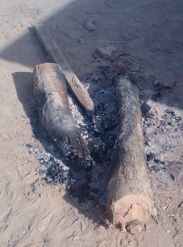 Two charred logs and a rectangular piece of wood lay on the ground surrounded by ash