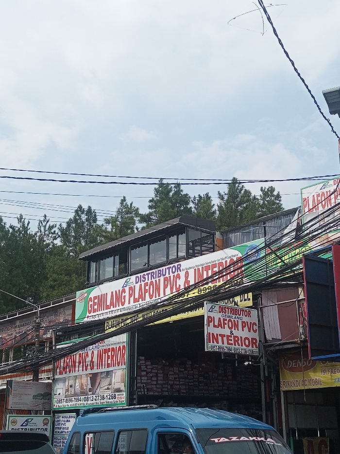 shop named "Gemilang Plafon PVC & Interior," a distributor of PVC and interior materials. The storefront has a visible sign with contact numbers. The shop appears well-stocked with its products. Utility wires crisscross the foreground. A blue van is partially visible in front. Further background includes a line of tall green trees and a clear sky.
