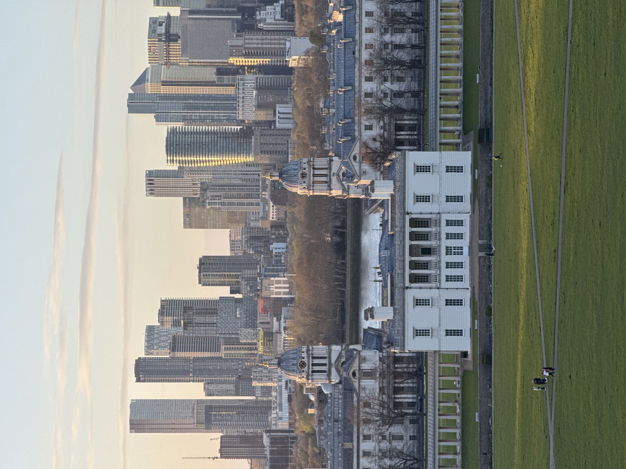 reversed view of London, United Kingdom. On the left, modern skyscrapers rise against a hazy sky. In the center, historical buildings and greenery meet the river Thames, with the distinctive blue dome of the Old Royal Naval College chapel visible. On the right, green fields with walking paths are populated by a few individuals. The overall impression is a juxtaposition of modern and historical London, with a clear contrast between urban and natural spaces.