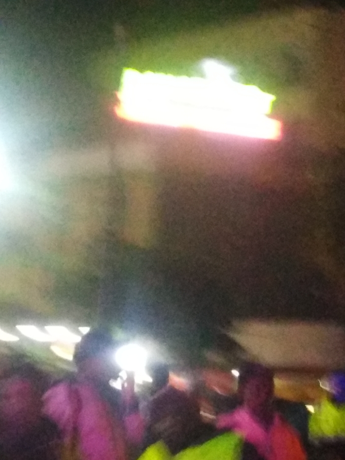 A blurry, low-quality image captures a crowd at night. Several people are visible in the foreground, their features obscured by motion blur and poor lighting. A glowing, rectangular sign with green and pink hues is seen in the upper part of the image. The dark background further contributes to the overall indistinctness, making details hard to discern.
