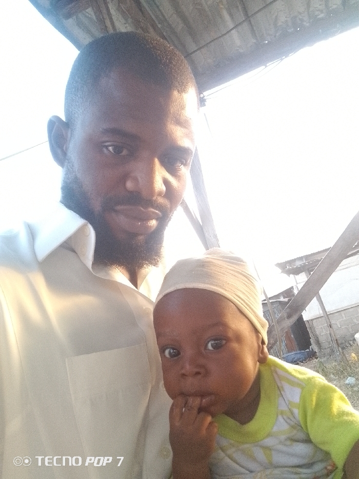 A man and a baby are in the frame. The man has dark skin, a beard, and short hair, wearing a white collared shirt. The baby, nestled close, is wearing a light-colored head covering and a patterned shirt with a green neck trim. The baby's fingers are near its mouth. The background shows an open space with what appears to be a roof structure and a hint of an unkempt yard. The lighting seems bright, potentially outdoors, and the image bears the watermark "TECNO POP 7" at the bottom.