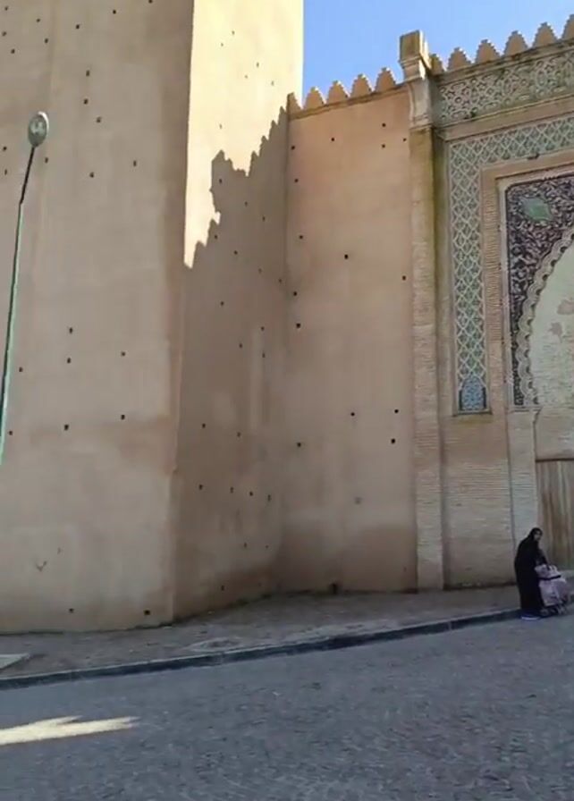 view of a large, ornate arched gate leading into a city or town. The gate is made of light brown brick and features intricate tilework in blue, green, and white. People and a few vehicles pass through the gate. The camera then pans to the right to reveal a high, thick wall that appears to be part of the city's defenses. The wall is made of the same light brown brick as the gate and is dotted with small openings. The area outside the wall is paved and includes a park-like space with trees, grass, and decorative fencing. In the distance, there is a view of the city, possibly situated on a hill or overlooking a valley. Palm trees and other vegetation are visible. The sky is clear and blue.