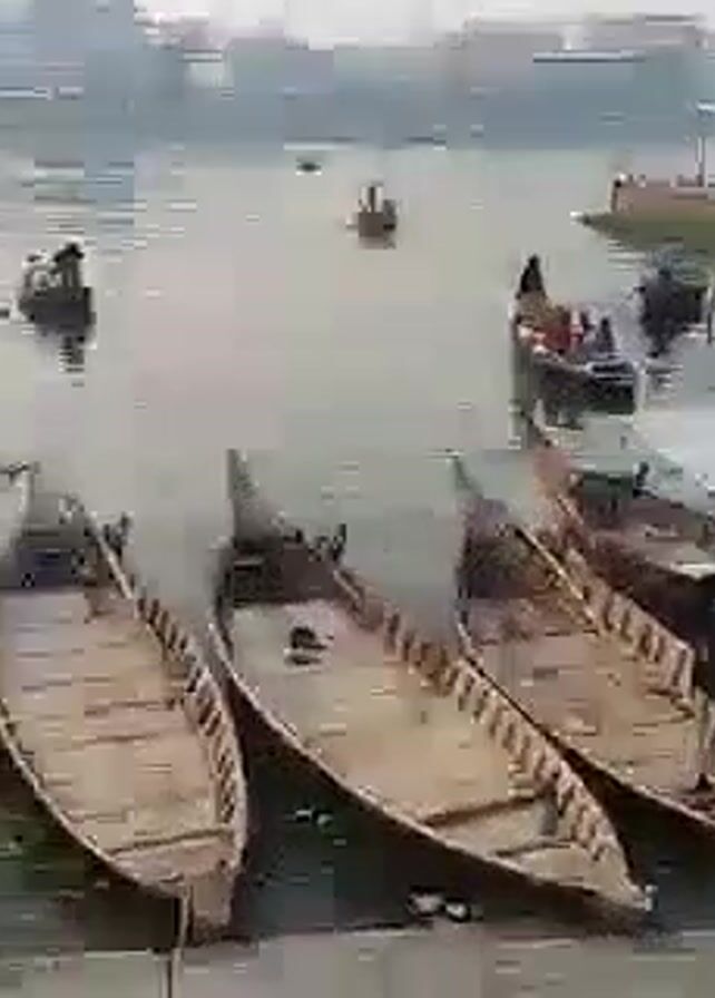 river scene, possibly in Bangladesh. Several wooden boats are docked along the riverbank. Some of the boats are empty, while others have people on board. People can also be seen rowing smaller boats on the water. In the background, there is a large building or dock with a bridge-like walkway extending over the river. The sky is overcast, suggesting either early morning or late afternoon.