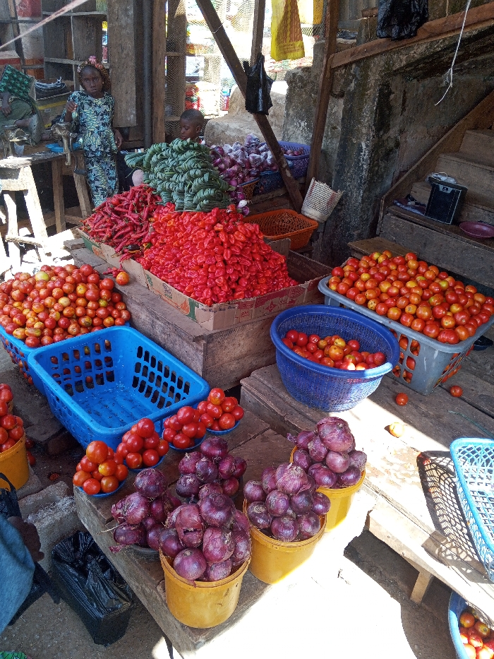 This image depicts a bustling produce market stall in Akwanga, Nigeria