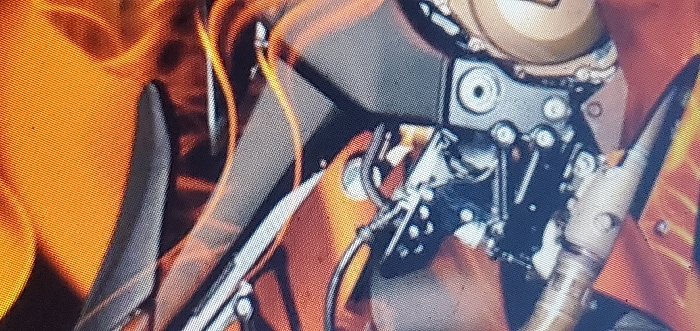 The image presents a fragmented view of a complex mechanical object, possibly a robotic or cybernetic construct