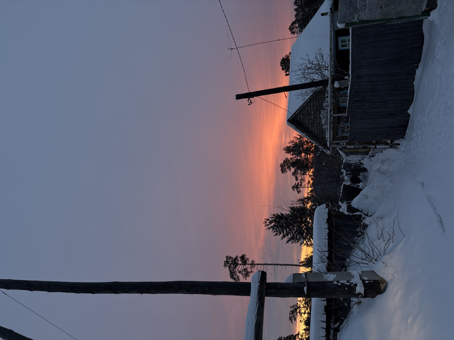 A vertical outdoor shot shows a snowy scene with an orange-pink sky. A wooden fence runs parallel to the bottom edge, heavily dusted with snow. Silhouetted trees and a wooden structure with a snow-covered roof are adjacent to the fence. Power lines stretch across the sky, adding to the rustic winter landscape. The horizon line is low, emphasizing the sky's colorful gradient.