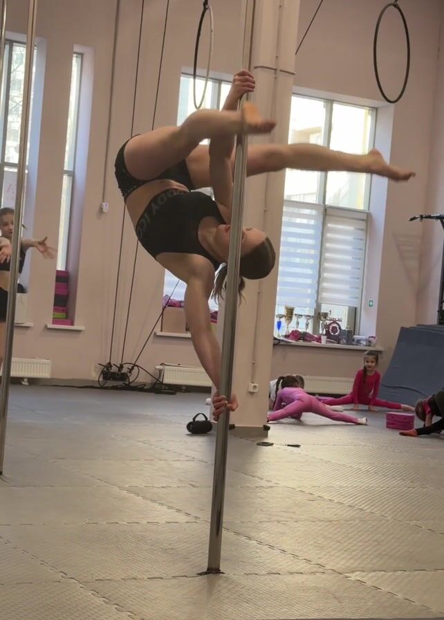 A young woman in a black sports bra and shorts is shown doing a pole dance move in a studio