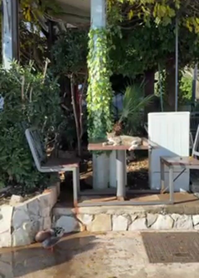 The scene depicts a cat lounging on a metal table outside, in an area with lush greenery. The cat is light brown and gray, stretched out comfortably on the tabletop. Adjacent to the table are metal chairs and benches. A duck is present on the ground, near the base of the stone structure that supports the table. The setting appears to be a casual outdoor space, possibly near a cafe or restaurant. The lighting indicates it is daytime, with shadows cast across the ground. A pole covered in climbing vines stands nearby.