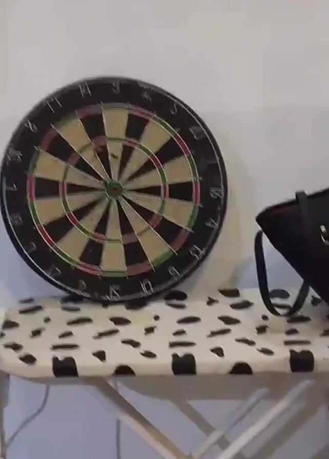 A dartboard sits on an ironing board. A person throws darts at the board, hitting the bullseye on the first try, and the 8-point wedge on the second throw. A black bag sits beside the board on the ironing board. A white wall provides the background.