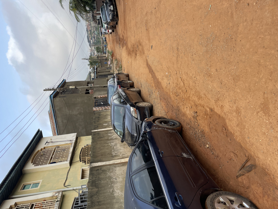 A narrow dirt road lined with parked cars on one side and buildings on the other. The cars are mostly compact models, and the buildings are a mix of residential and commercial. Power lines stretch across the sky. The road appears to be in a developing area, with some buildings looking newer than others. The sky is partly cloudy.