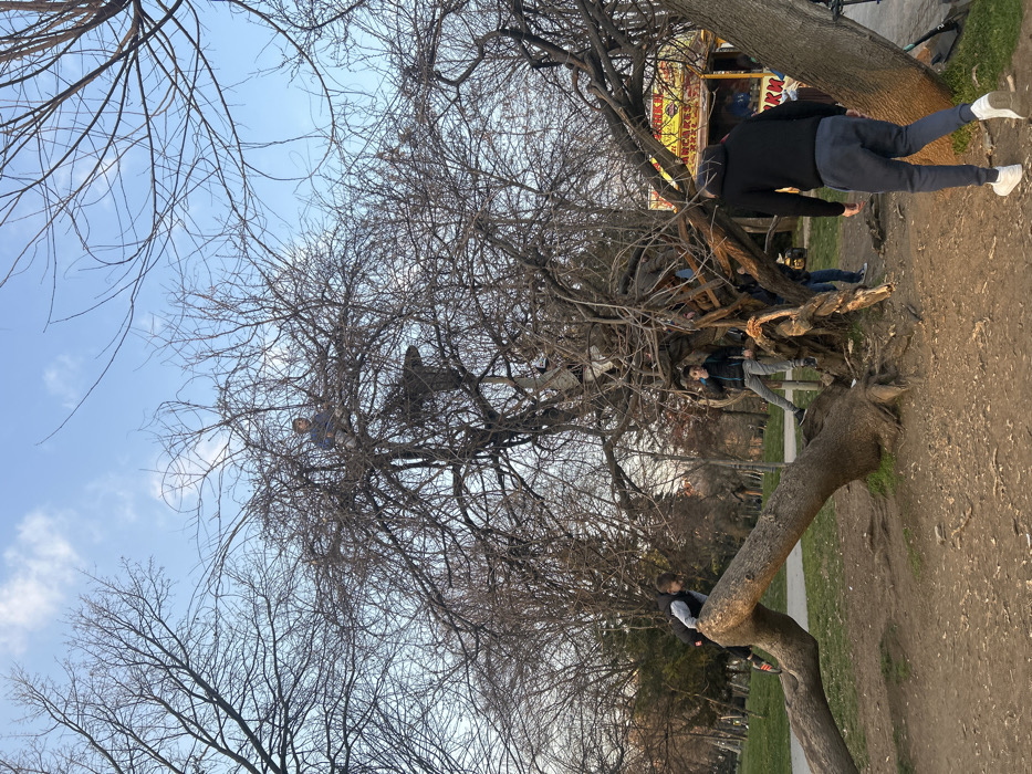 The image depicts a late afternoon scene within Borisova Gradina park in Sofia, Bulgaria. A prominent, large deciduous tree with dense, bare branches dominates the center and left, its exposed roots visible at the base. Multiple individuals, primarily youths, are interacting with the tree. One youth in a blue top and light pants sits high in the upper branches, looking right. Several other individuals are positioned lower in the tree, within its dense branches and a visible rudimentary wooden platform structure. To the immediate left, a boy in a dark vest and shirt balances on a thick, horizontal tree trunk extending from the main tree. In the right foreground, a male adult, viewed from behind, walks rightward, wearing a black hoodie, dark sweatpants, and white sneakers. In the mid-ground right, a yellow food stand with Cyrillic text, including "ПАЛАЧИНКИ" (Pancakes) and "КРЕМВИРШКИ" (Hot Dogs), is partially visible. The ground consists of compacted dirt and sparse dry grass. The sky above is blue with scattered clouds, and distant bare trees line a path in the background. A dark-colored scooter or similar rideable object is visible on the ground near the walking adult.