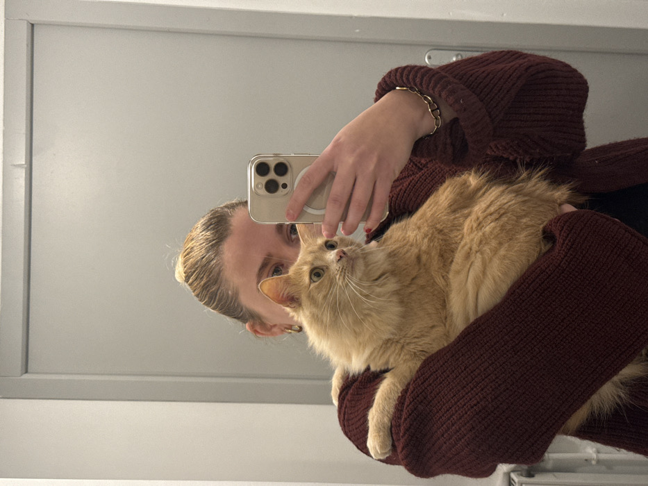 A woman takes a selfie in a mirror while holding a ginger cat. The cat is nestled in her maroon cardigan. The woman's hair is pulled back, and she wears a gold bracelet. The phone is a modern iPhone, and its camera is partially obstructing her face. The background is a plain, light gray wall and doorframe.