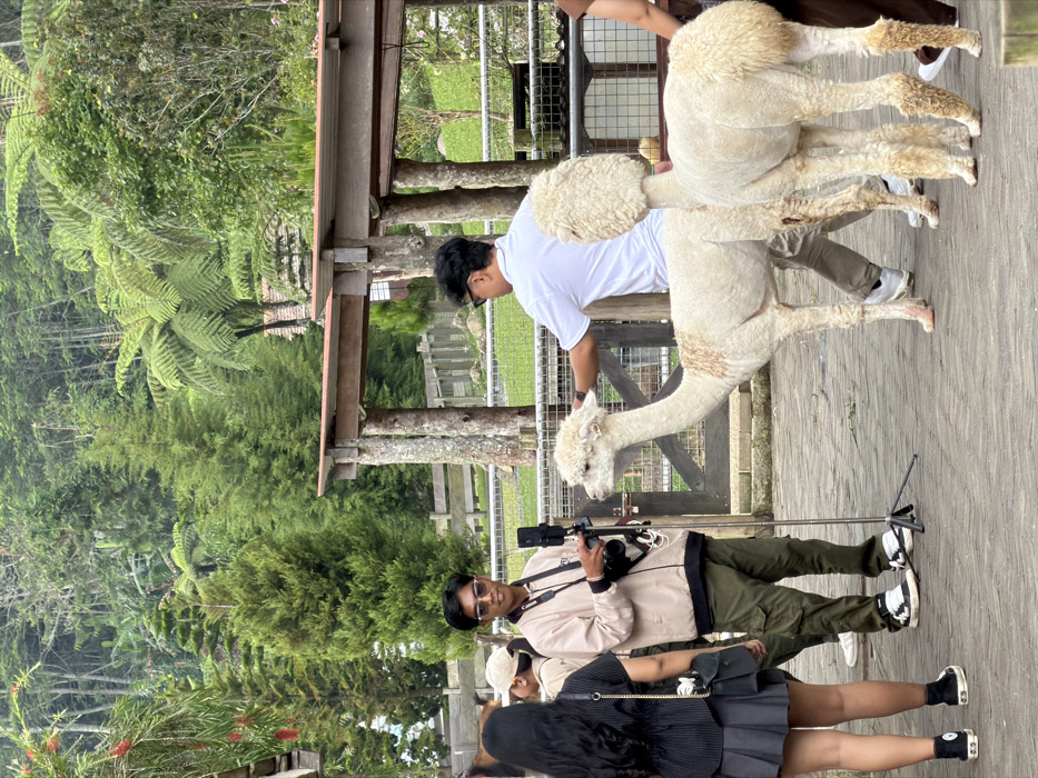 Two men are interacting with three alpacas at a farm. One man in a white shirt is petting the alpacas. Another man is recording the interaction. Two people are standing behind the second man. The setting appears to be an outdoor enclosure with a wooden fence. Lush greenery, including trees and ferns, surrounds the area. A wooden structure provides shelter.