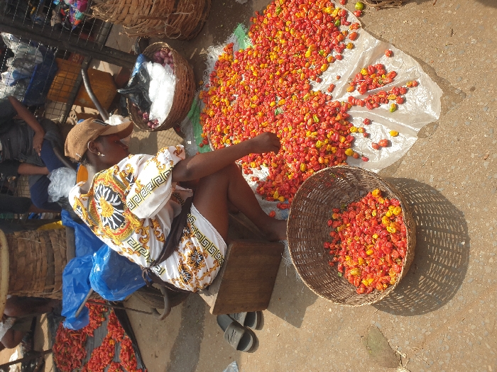 An outdoor market scene in Nkpor, Nigeria, features a woman squatting on a wooden block in the foreground