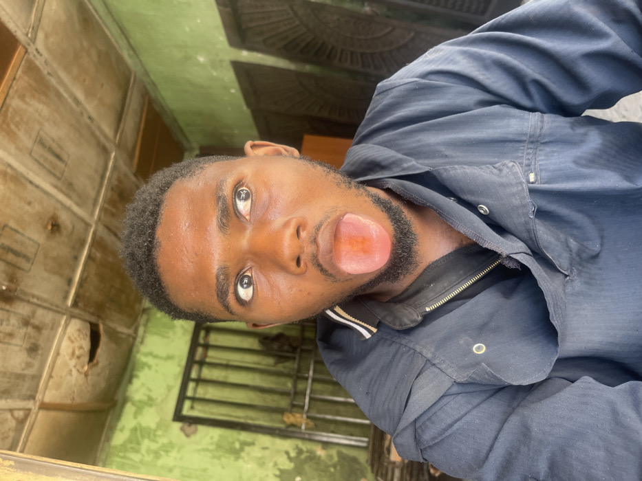 One male individual, appearing to be a young adult, is depicted making a humorous facial expression. He has dark skin, short dark hair, and a dark stubble beard. His eyes are rolled upwards and to the right, and his mouth is open with his tongue extended straight out. He is wearing a dark blue, long-sleeved garment, possibly a utility shirt or jacket, featuring a partial zipper front, two metal snap buttons on the upper chest, and a visible striped pattern on the inside of the collar near the left shoulder. The environment behind him includes a distressed, light green-painted wall to the left, with a dark metal barred structure, possibly a window or gate, visible. To the right, two dark wooden structures, likely doors with carved details, are partially visible. Overhead, a ceiling constructed of light-colored rectangular panels shows signs of damage, with one panel appearing missing or broken near the top center. The scene is located in Zaria, Nigeria.
