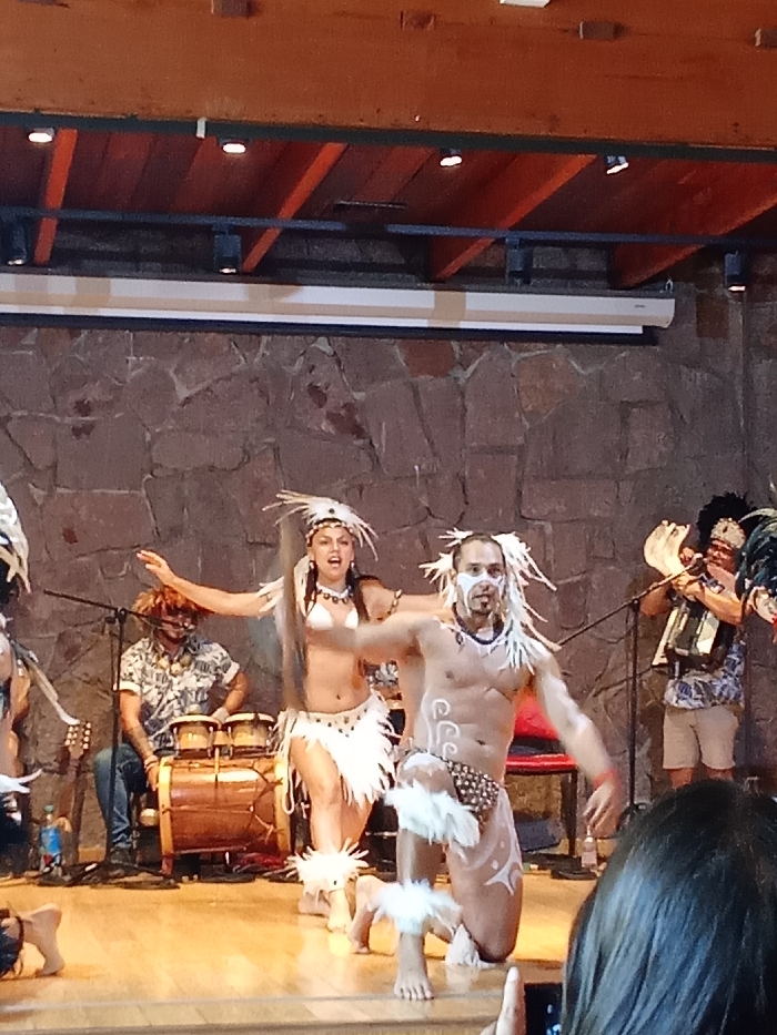 A group of people are performing on a stage. Two dancers are in the foreground, wearing minimal clothing adorned with white feathers and body paint. Behind them, musicians play instruments, including drums and an accordion. The backdrop is a stone wall. The dancers' costumes and movements suggest a traditional or cultural dance performance. In the audience a person is taking a video with his cell phone.