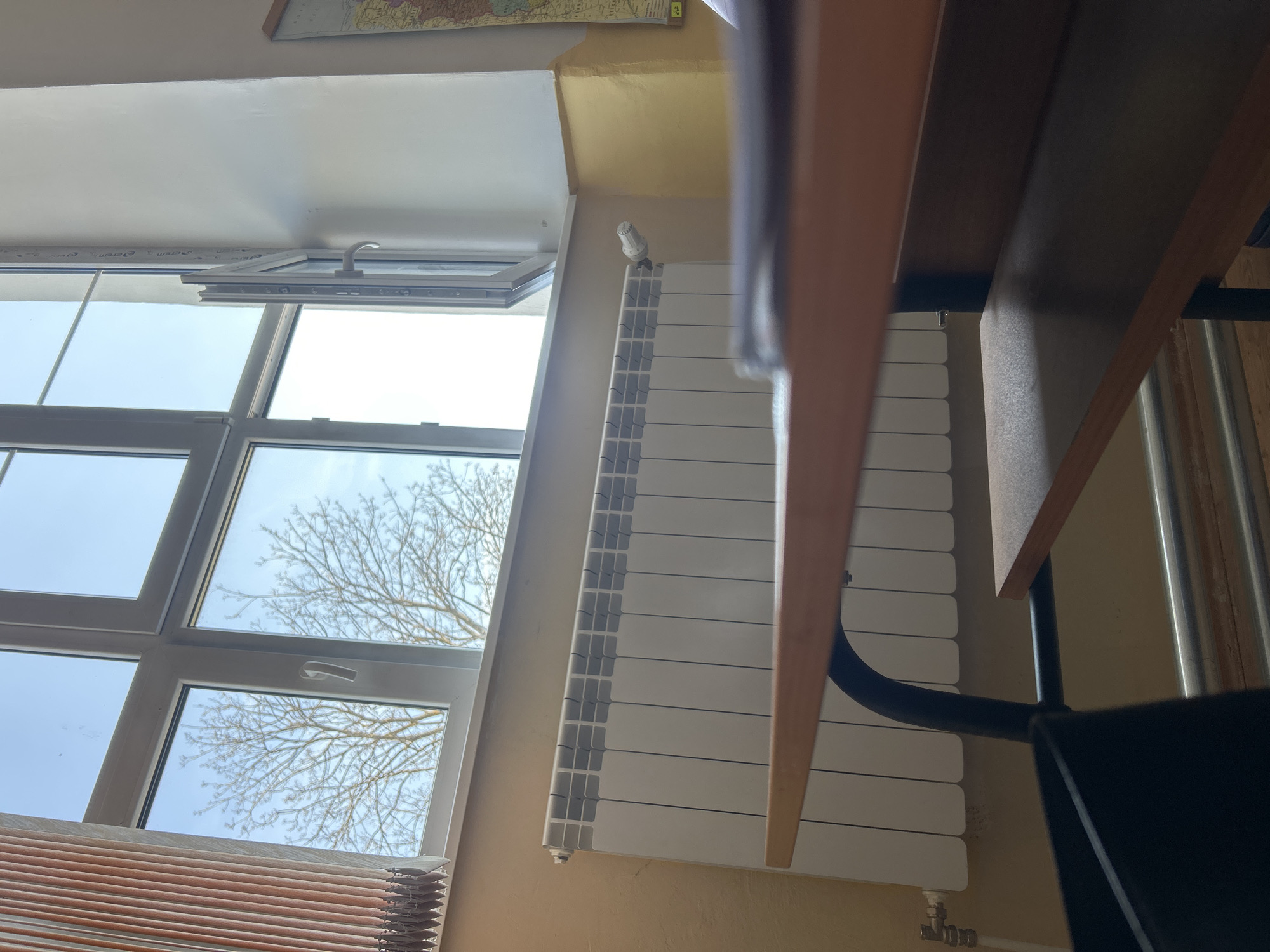 The scene depicts the interior of a room, located in Ruse, Bulgaria, viewed from a low angle facing a window and a desk. A multi-pane window with white PVC frames is centered in the upper half of the image. The top-right window pane is open inward, angled for ventilation. Outside, a clear blue sky is visible, along with the bare, intricate branch structure of a deciduous tree. A light-colored, vertically pleated blind is partially visible on the left side of the window. Below the window, a white, multi-sectioned central heating radiator is mounted against a light beige wall. A thermostatic radiator valve is affixed to the right side of the radiator. The wall to the immediate right of the window frame is white, featuring a partially visible, framed world map on its upper portion. In the foreground, a wooden desk with a light brown top and dark metal support frame occupies the lower half of the image. A dark, rectangular object, possibly a notebook or tablet, rests on the desk surface in the blurry foreground. A lower, darker shelf is integrated into the desk structure. A segment of a dark-colored chair is visible in the bottom-left. No individuals are present or engaged in any discernible actions or interactions within the frame. The room is brightly illuminated by natural light entering from the exterior.